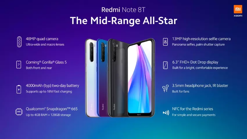 Pozostałe funkcje Redmi Note 8T są takie same: 6,3-calowy wyświetlacz FHD + IPS, układ Snapdragon 665, 3/4 GB pamięci RAM, 32/64/128 GB pamięci ROM, bateria 4000 mAh, szybkie ładowanie 18 W, port USB-C i Kamera główna to 48 MP + 8 MP + 2 MP + 2 MP.