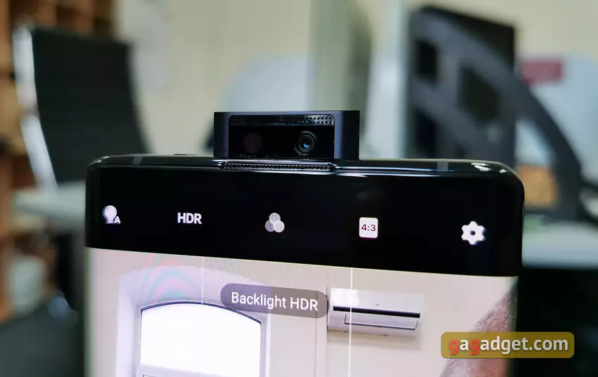 Przednia kamera smartfona jest chowaną. Ale w przeciwieństwie do smartfonów, które widzieliśmy wcześniej, moduł znajduje się nie z boku, ale w środku. Na nim jest sama kamera, lampa błyskowa i ten sam głośnik konwersacyjny.