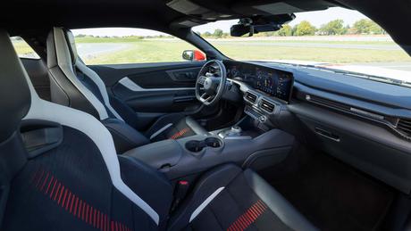 Wewnątrz nowa edycja specjalna Mustanga ma czarne skórzane fotele z białymi wstawkami i czerwonym paskiem pośrodku. Niebieskie kontrastowe szwy znajdują się w całej kabinie. Tytanowe elementy zostały dodane do łopatek zmiany biegów i pierścienia zmiany biegów.