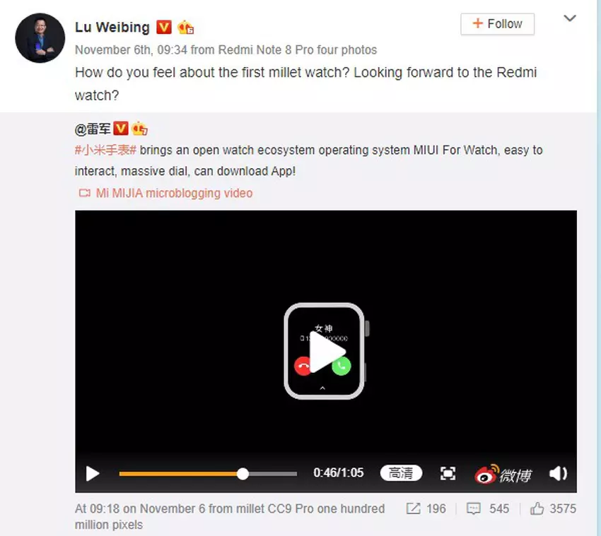 Wskazał na to szef jednostki, Liu Weibing (Lu Weibing) w chińskiej sieci społecznościowej Weibo. Zapytał użytkowników, czy chcieliby zobaczyć zegarek Redmi. Weybing nie podał żadnych innych informacji. Najprawdopodobniej producent jak dotąd „tylko bada grunt”.