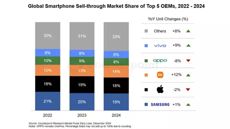 Ogólnie rzecz biorąc, rynek smartfonów w 2024 r. wzrósł o 4% rok do roku, co jest pozytywnym sygnałem dla producentów i nabywców. Samsung utrzymał pozycję lidera z 19% udziałem w rynku, dzięki udanej sprzedaży serii Galaxy S24 i Galaxy A. Apple zajęło drugie miejsce z 18% udziałem, ale seria iPhone 16 otrzymała mieszane recenzje ze względu na ograniczoną dostępność Apple Intelligence. Pierwszą piątkę zamykają Oppo i Vivo.