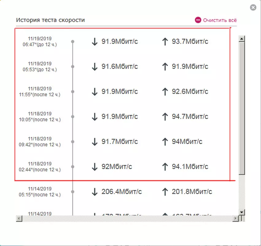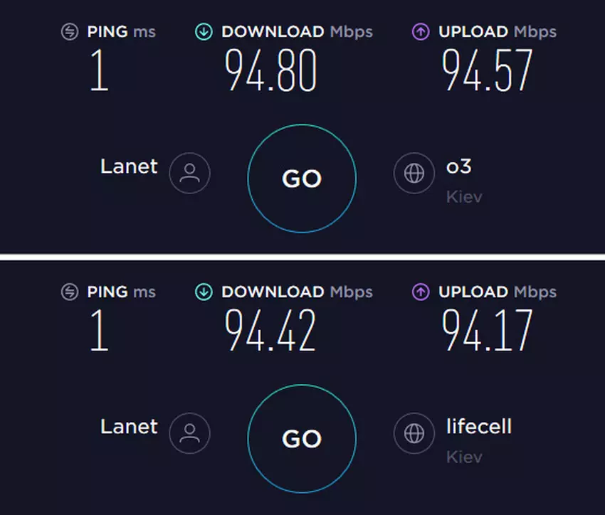 Archer C4000 z domyślną maksymalną mocą wszystkich trzech zainstalowanych kanałów Wi-Fi z łatwością pokrywa małe 2-pokojowe mieszkanie, mimo że nie było w centrum mieszkania, ale w odległym rogu. Użyto połączenia gigabitowego z dostawcą Lanet, ale prędkość połączenia została ograniczona do 100 Mbit / s zgodnie z planem taryfowym. Router Speedtest wbudowany w interfejs internetowy routera stabilnie pokazywał prędkość połączenia 93-95 Mb / s, na komputerze podłączonym do routera za pomocą kabla prędkość była taka sama, a nawet nieco większa (najwyraźniej wybór serwera był bardziej udany):