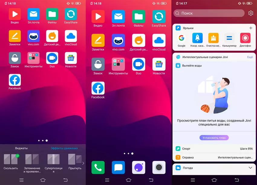 Powłoka zapewnia zestaw wstępnie zainstalowanych aplikacji. Uważam, że może się nieznacznie różnić w zależności od modelu. Ogólnie jest znany, ma wszystko, czego potrzebujesz. Odtwarzacz muzyki i wideo, menedżer smartfonów (z funkcją czyszczenia i innymi funkcjami serwisowymi), menedżer plików, kalkulator, dyktafon, tuner FM, notatki, klient poczty e-mail, własna usługa chmury vivo, kompas, poziom i EasyShare do szybkiego przesyłania treści, w tym bez mobilnego internetu lub wifi.