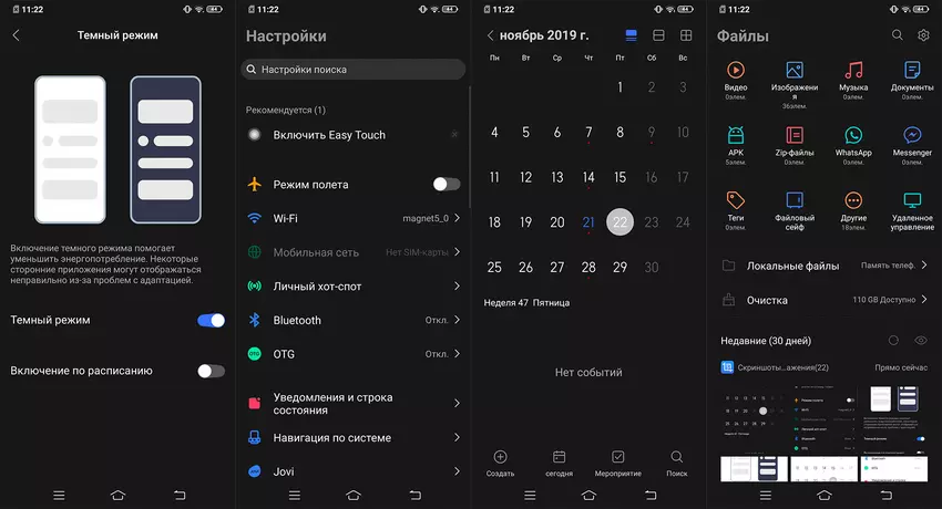 Jeśli chcesz, możesz przejść do ciemnego motywu, szczególnie w przypadku modeli z ekranami AMOLED. Podczas przełączania nie oddzielne menu, ale wszystkie elementy interfejsu zmieniają się zgodnie z tematem. Jest to uwzględnione w ustawieniach „Ekranu i jasności”.