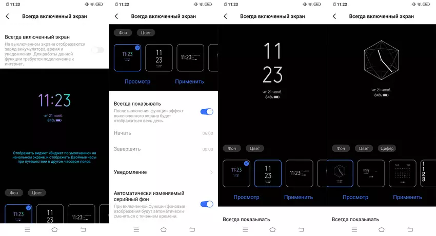 Modele z wyświetlaczami AMOLED mają funkcję Always on Display, która nie wymaga specjalnej prezentacji. Na ekranie będą wyświetlane godziny i powiadomienia. Istnieją różne opcje zegarków i ich kolorów.