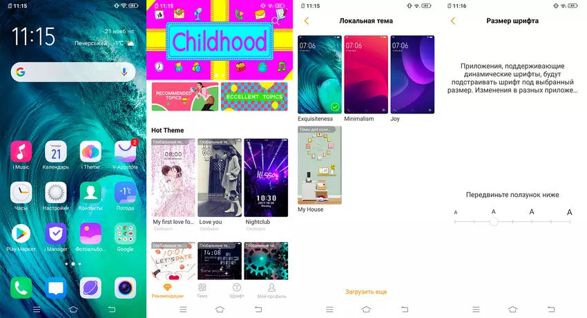 Tradycyjnie producenci całkowicie (lub prawie całkowicie) przerysowują wygląd systemu operacyjnego nie do poznania. Począwszy od ikon, czcionek, schematów kolorów i kończąc na wszystkich animacjach. Tak więc w Funtouch OS: wszystko jest przerysowane, istnieją różne motywy, w tym te do pobrania. Można zmienić rozmiar czcionki (i samą czcionkę). Ikony można również dostosowywać, ale nie tylko pod względem wielkości. Możliwe jest wybranie ich kształtu od kwadratowego do okrągłego z opcjami pośrednimi.