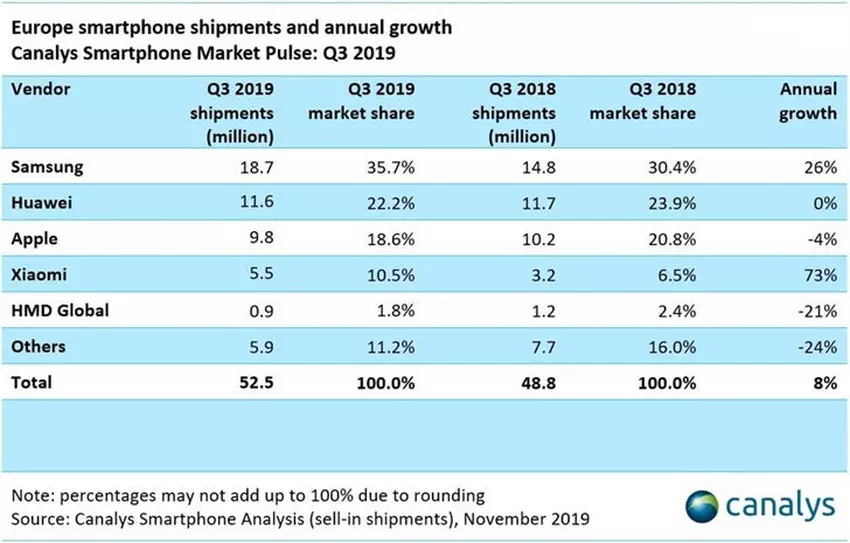 Canalys zbadał europejski rynek smartfonów i zidentyfikował liderów wśród producentów. Na pierwszym miejscu jest Samsung, który dostarczył 18,7 miliona smartfonów w trzecim kwartale tego roku i zajmuje 35,7% rynku.