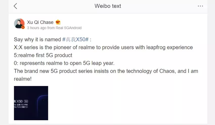 Szef pod-marki OPPO opublikował plakat w chińskiej sieci społecznościowej Weibo, zgodnie z którym urządzenie wejdzie na rynek pod nazwą Realme X50.