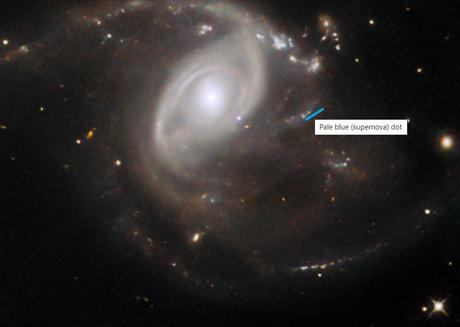LEDA 22057 jest miejscem wybuchu supernowej, która została odkryta dokładnie rok temu - w styczniu 2024 roku. Supernowa jest widoczna na tym zdjęciu tuż poniżej i na prawo od centrum galaktyki spiralnej jako bladoniebieska kropka SN 2024PI.