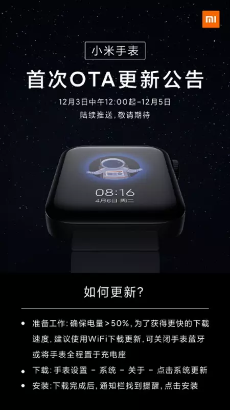Firma Xiaomi ogłosiła pierwszą aktualizację oprogramowania dla Inteligentnego zegarka Mi Watch, który został wypuszczony w listopadzie.