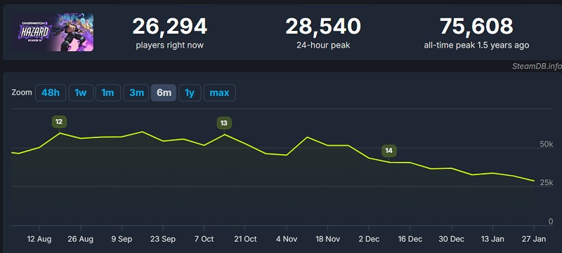 I tak, według SteamDB, przed premierą Marvel Rivals, Overwatch 2 miał średnio 34 tysiące graczy, podczas gdy obecnie liczba ta odpowiada 20-25 tysiącom.