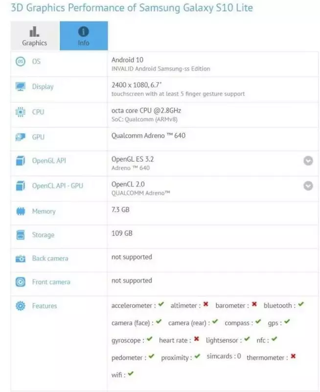 Na początek smartfon pojawił się w bazie danych testu porównawczego GFXbench, który potwierdził niektóre cechy Galaxy S10 Lite.