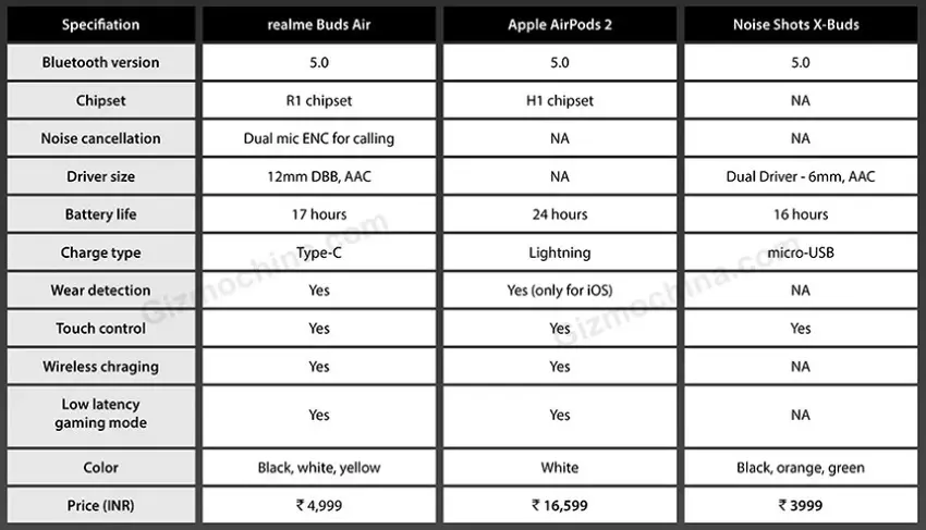 Informacje udostępniła Gizmochina, publikując tabelę porównawczą z Apple AirPods 2 i Noise Shots X-Buds. Nowość od Realme będzie mogła pochwalić się Bluetooth 5.0, sterownikami 12 mm i autonomią do 17 godzin z ładowaniem z futerału. Ten z kolei otrzyma port USB-C i obsługę ładowania bezprzewodowego. Słuchawki będą miały także sterowanie dotykowe, funkcję szybkiego połączenia, czujnik zbliżeniowy i tryb grania z niskim opóźnieniem.