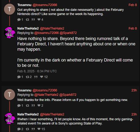 NateTheHate nie słyszał niczego, co wskazywałoby na to, że Nintendo planuje kolejny duży pokaz, a jedynym lutowym wydarzeniem, którego jest pewien, jest State of Play Sony(podobno odbędzie się 14 lutego).