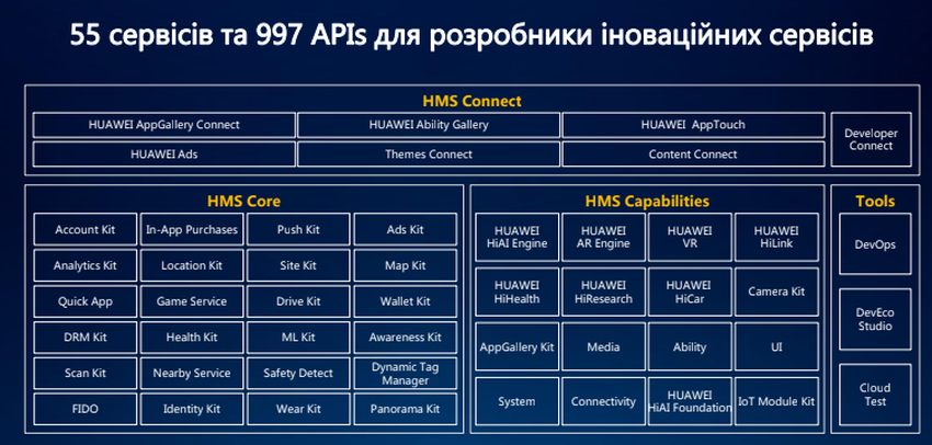 Jest to zestaw narzędzi technicznych, które programista może wdrożyć (lub nie może, według własnego uznania) w aplikacji. Są to na przykład interfejsy API, narzędzia do autoryzacji, akceptacji płatności, rozpoznawania emocji i wiele innego od Huawei. Teraz jest ich 24, a firma pracuje nad dużą liczbą. Nawiasem mówiąc, cały personel programistyczny znajduje się w Chinach.