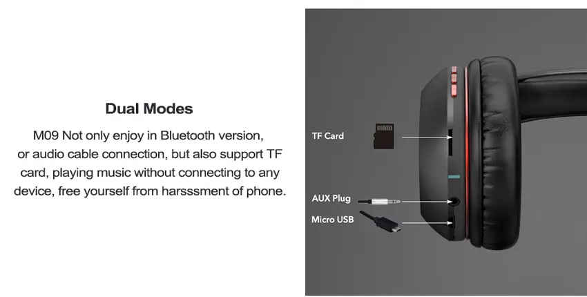 Słuchawki otrzymały głośniki 40 mm, wbudowany mikrofon, obsługują karty pamięci microSD i profile audio HSP, HFP, A2DP, AVRCP.