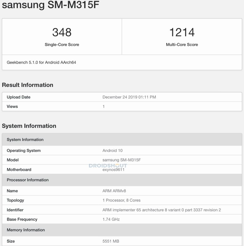 Według danych Geekbench, Galaxy M31 otrzyma procesor Exynos 9611 z 8 rdzeniami ARM Cortex-A73 i ARM Cortex-A53 o częstotliwości taktowania do 2,3 GHz i 1,7 GHz. Ilość pamięci RAM wynosi 6 GB.