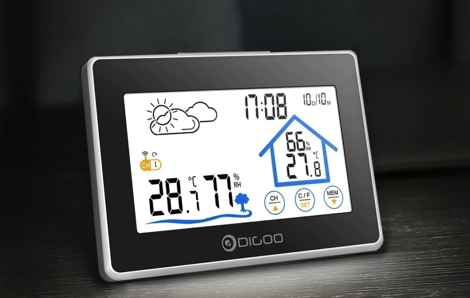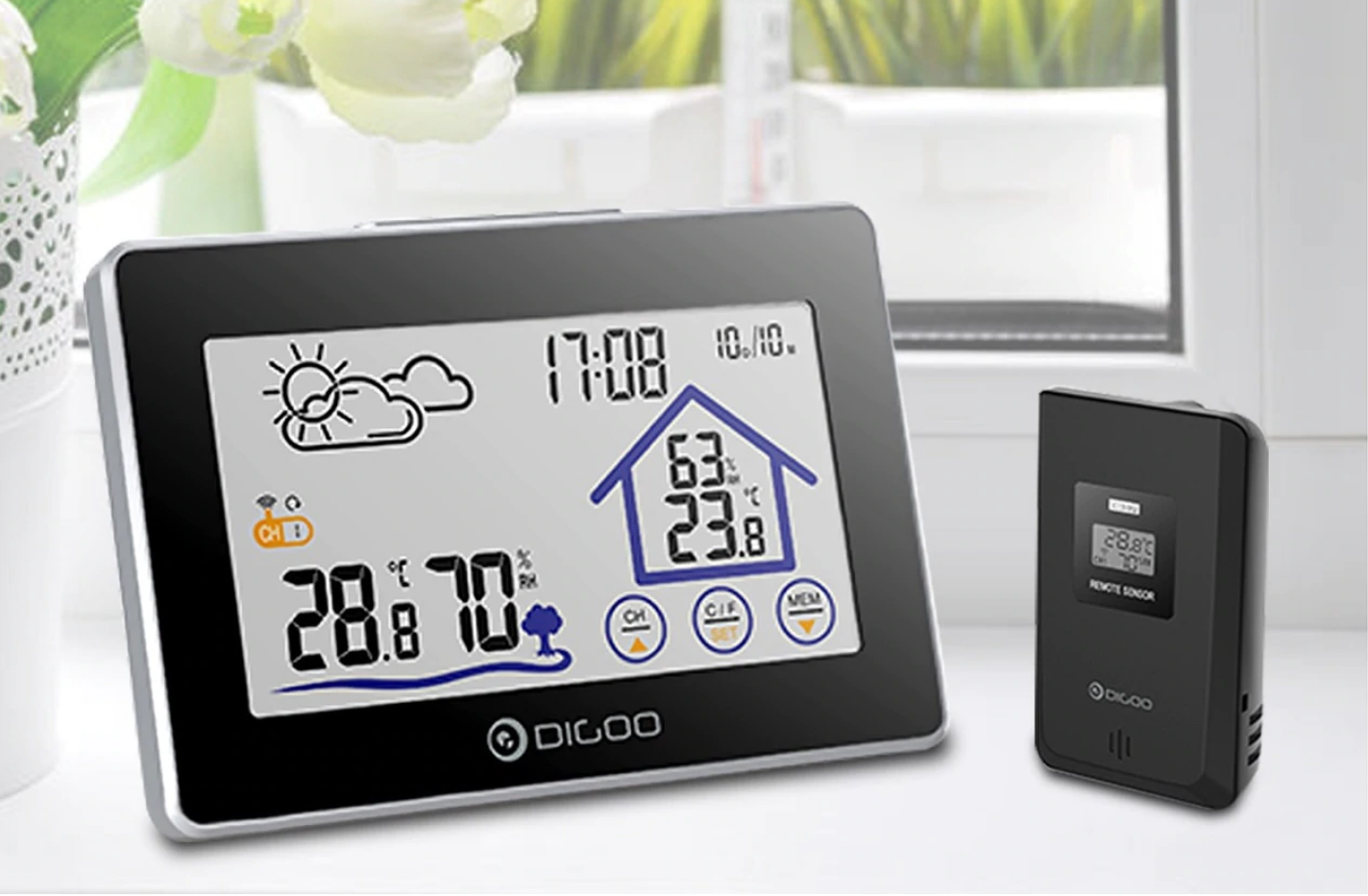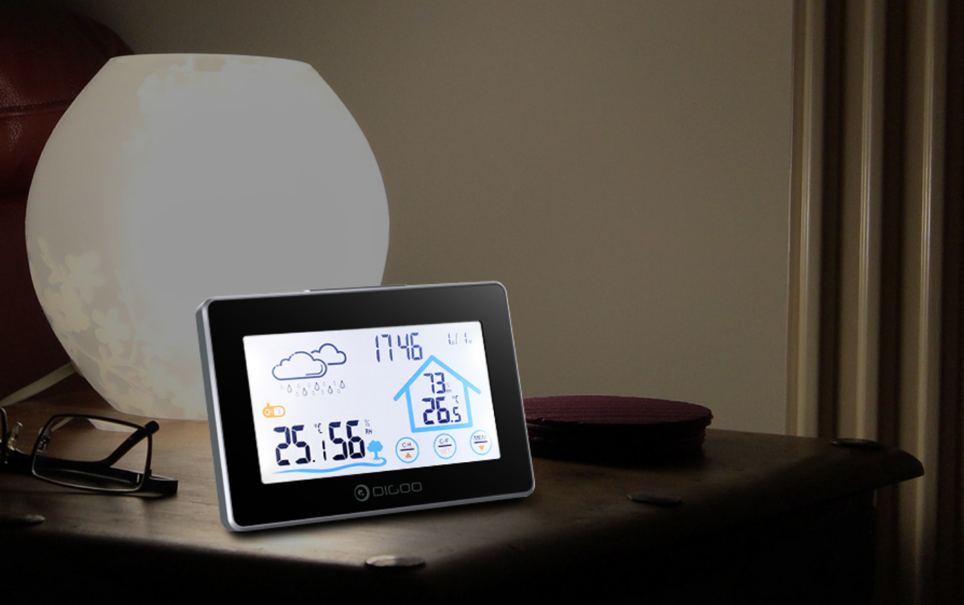 Digoo DG-TH8380 jest wykonany w formie tabletu i wykonany z tworzywa sztucznego. System jest kontrolowany za pomocą ekranu dotykowego, który wyświetla podstawowe informacje. Dzięki kompletnemu czujnikowi zainstalowanemu na ulicy stacja pogodowa wyświetla prognozę pogody, temperaturę za oknem, wilgotność, a także czas.