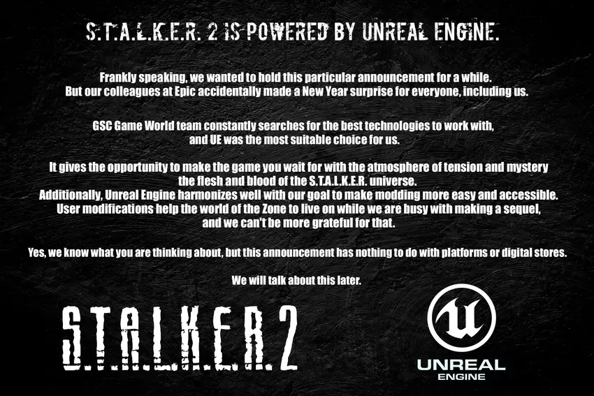 „Ten [silnik] umożliwia stworzenie gry z napiętą atmosferą i tajemnicą wszechświata STALKER. Ponadto Unreal Engine dobrze zgadza się z naszym celem - ułatwienie modowania i obniżenie kosztów. Niestandardowe modyfikacje wspierają życie Strefy, gdy jesteśmy zajęci tworzeniem kontynuacji i nie możemy być za to bardziej wdzięczni ”- napisali programiści na Twitterze.