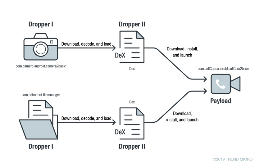 SideWinder wstrzykuje złośliwe oprogramowanie do smartfona w dwóch krokach. Najpierw Camero lub FileCrypt Manager pobierają plik DEX (format pliku Android) z własnego serwera zarządzania i kontroli. Następnie określony plik pobiera inny plik w formacie APK i instaluje go bez wiedzy użytkownika. Do tajnej instalacji program wykorzystuje zaciemnianie, szyfrowanie danych i wywołanie dynamicznego kodu.