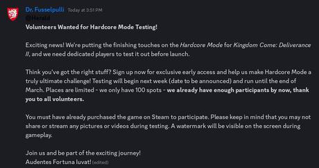 Ochotnicy szybko się znaleźli, więc należy się spodziewać, że Warhorse nie będzie długo zwlekać i doda tryb Hardcore w najbliższych aktualizacjach.