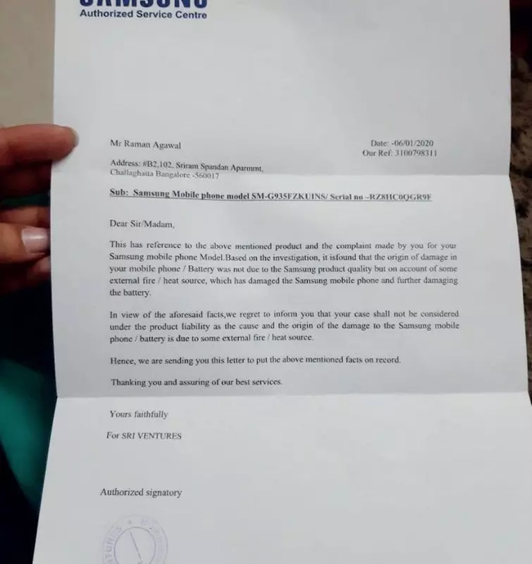 Sima skontaktowała się następnie z centrum serwisowym Samsung, ale stwierdzili, że incydent związany był z wpływami temperatury zewnętrznej.