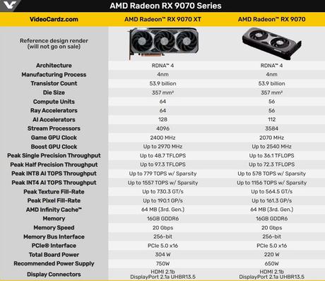 Zacznijmy od informacji, które dotyczą obydwóch modeli kart graficznych: AMD Radeon RX 9070 XT i RX 9070 otrzymają 53,9 mld tranzystorów, 357 mm² powierzchni, 16 GB pamięci wideo GDDR6 (20 Gb/s) z 256-bitową magistralą, a także 64 MB pamięci podręcznej Infinity 3. generacji. GPU otrzymają wsparcie dla PCIe 5.0 x16, porty HDMI 2.1b i DisplayPort 2.1a (UHBR13.5).