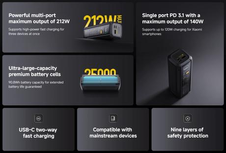 Ten Power Bank z baterią o pojemności 25 000 mAh jest wyposażony w trzy porty: dwa USB-C i jeden USB-A. Obsługuje maksymalną moc ładowania 212 W, co czyni go jednym z najszybszych rozwiązań do ładowania na rynku. Dzięki mocy wejściowej 120 W może w pełni naładować się w zaledwie 90 minut, minimalizując czas bez użycia.