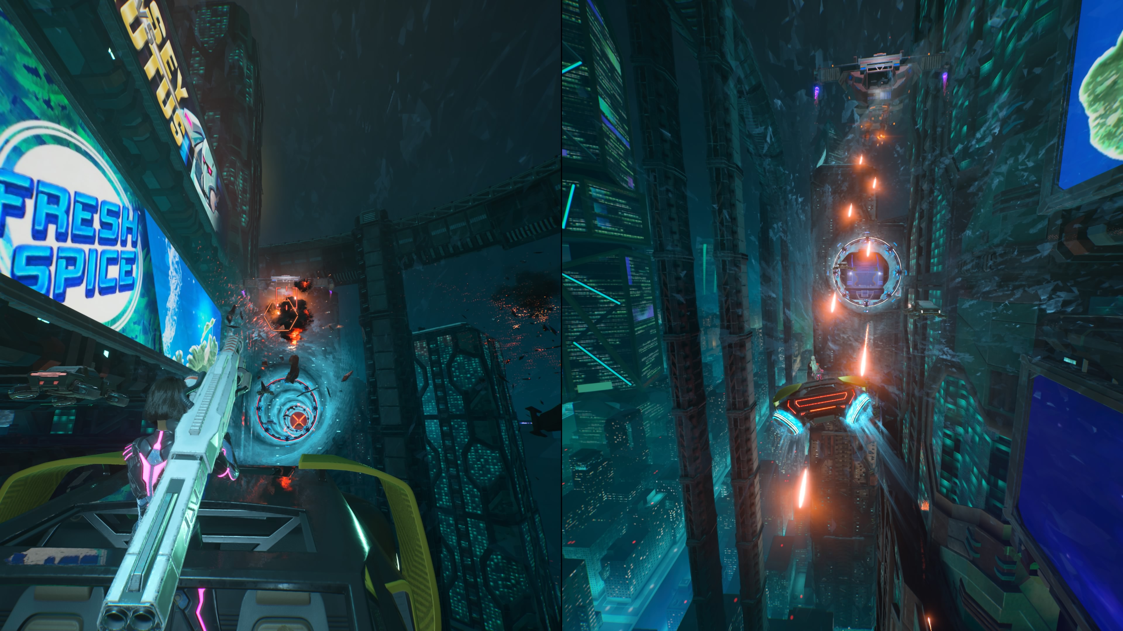 W Split Fiction zawsze coś się zmienia, nawet w obrębie jednego rozdziału. Oto jesteśmy cyber ninja w ogromnym cyberpunkowym mieście, ale nie będziemy tylko biegać z mieczami przez cały czas. Będziemy musieli rozwiązywać zagadki, które bawią się przestrzenią, gdzie interakcja ze sobą jest najważniejsza. Następnie zostajemy wrzuceni w pościg samochodowy, gdzie musimy zestrzeliwać radiowozy, parkować i siekać bandziorów.