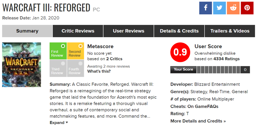 Warcraft 3: Reforged nadal spada w oczach graczy, otrzymując rekordowo niską ocenę użytkowników Metacritic.