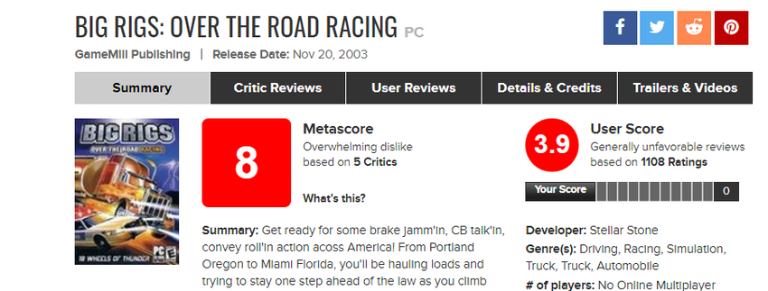 Warto zauważyć, że wcześniej, na tronie z sam wiesz czego i patyków siedziała Big Rigs: Over the Road Racing. Projekt jest zasłużenie nazywany „najgorsza gra na świecie”, a na Metacritic otrzymał 8 punktów od krytyków i aż 3.9 od graczy.