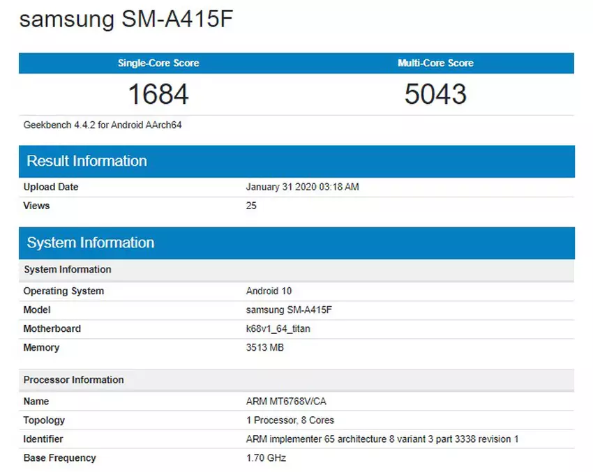 Nowość działa z numerem modelu SM-A415F i, zgodnie z raportem, działa na ośmiordzeniowym chipsecie MediaTek Helio P65. SoC jest oparty na technologii procesowej 12 nanometrów, a także ma dwa wysokowydajne rdzenie Cortex-A75 i sześć energooszczędnych Cortex-A55. Jest o około 20% mocniejszy niż Exynos 7904, który jest zainstalowany w obecnym modelu Galaxy A40. Kolejna wersja testowa smartfona ma 4 GB pamięci RAM i wstępnie zainstalowany system operacyjny Android 10.