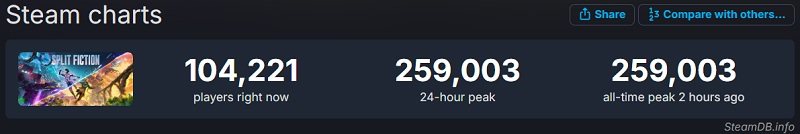 Już wcześniej informowaliśmy, że pierwszego dnia po premierze Split Fiction w sieciowym szczycie na Steam przekroczyło 100 tysięcy osób, ale było jasne, że liczba ta znacząco wzrośnie w kolejny weekend. I tak też się stało: w ciągu weekendu maksymalna liczba jednoczesnych graczy w Split Fiction zbliżyła się do 260 tys. Nie ma takich statystyk dla innych platform, ale nie ma wątpliwości, że gra cieszy się ogromnym zainteresowaniem również tam.