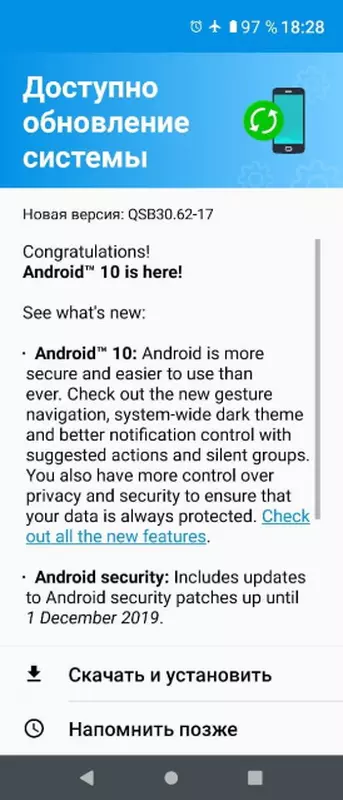 Najnowsza poprawka bezpieczeństwa, za grudzień, została dodana do nowego oprogramowania. Jednocześnie programiści zainstalowali w systemie wszystkie najważniejsze innowacje Androida 10, w tym zaktualizowany interfejs, globalny ciemny motyw, nowe gesty kontrolne i wiele innego.