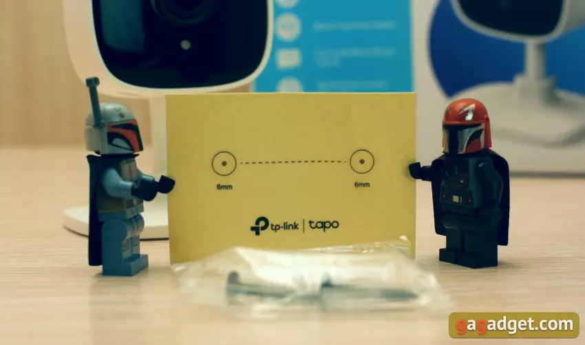 Nawiasem mówiąc, szablon montażowy jest naklejką z zaznaczonymi punktami, których odległość odpowiada otworom montażowym na korpusie kamery. Przyklejamy go do powierzchni, wiercimy we wskazanych miejscach, wkręcamy śruby i doskonale zawieszamy na nich aparat. Po prostu drobiazg, ale z jakiegoś powodu daleki jest od zawsze w pudełku na urządzenia z możliwością montażu na ścianie.