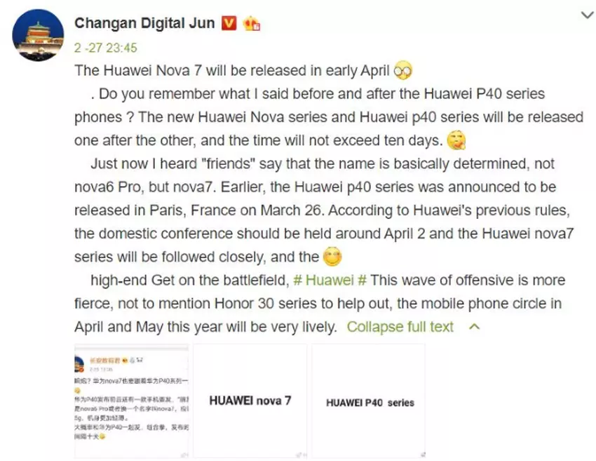 Według chińskiego informatora Digital Chat Station, natychmiast po ogłoszeniu Huawei P40 i Huawei P40 Pro, producent planuje wypuścić smartfon Huawei Nova 7. Będzie debiutować na początku kwietnia i otrzyma zastrzeżony procesor Kirin 990 oraz modem dla sieci piątej generacji.