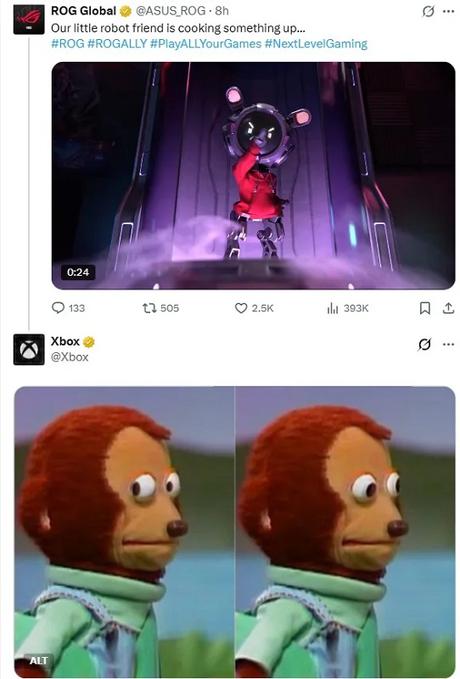 Oficjalne konto Xbox praktycznie od razu zareagowało na teaser własnym memem. To nie jest zaskoczenie, ponieważ kilka tygodni temu insajderzy Jez Corden i Tom Warren informowali, że ASUS i Microsoft pracują nad wspólną konsolą pod roboczą nazwą Project Kennan.