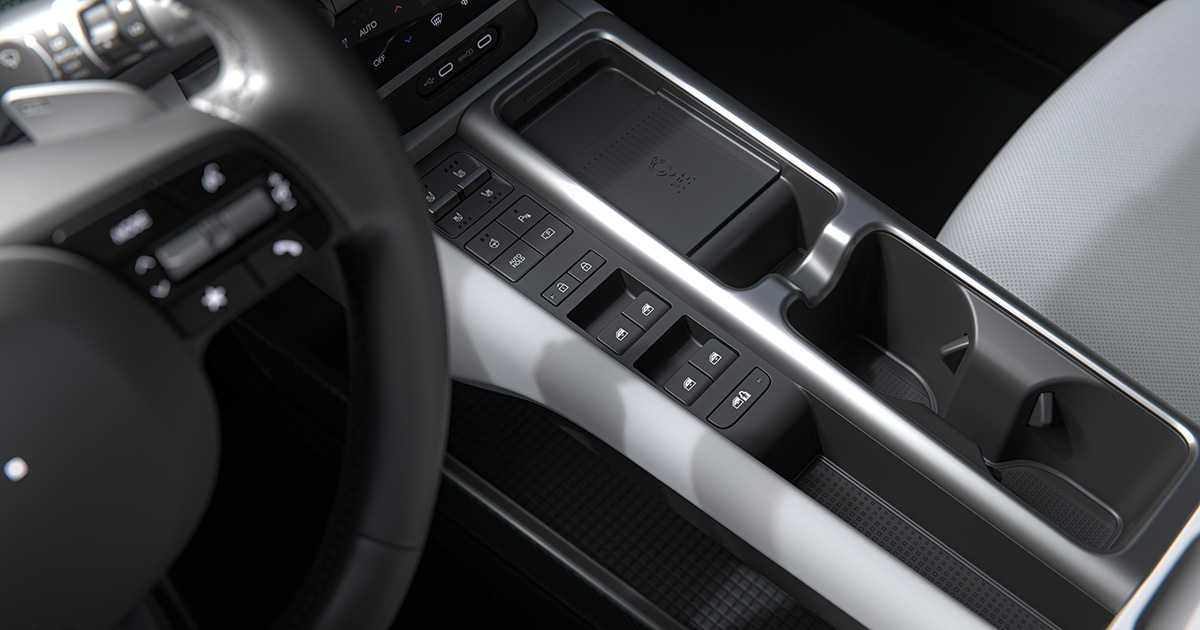 Ciekawe, że Hyundai zdecydował się zwiększyć liczbę fizycznych przycisków w kabinie, reagując na prośby klientów, którzy preferują tradycyjne elementy sterujące zamiast dotykowych. Na dolnej centralnej konsoli pojawiły się dodatkowe przyciski po lewej stronie od kubków oraz bezprzewodowej ładowarki. Przy tym niektóre elementy sterowania klimatyzacją pozostały, a ich wyświetlacz stał się nieco większy.