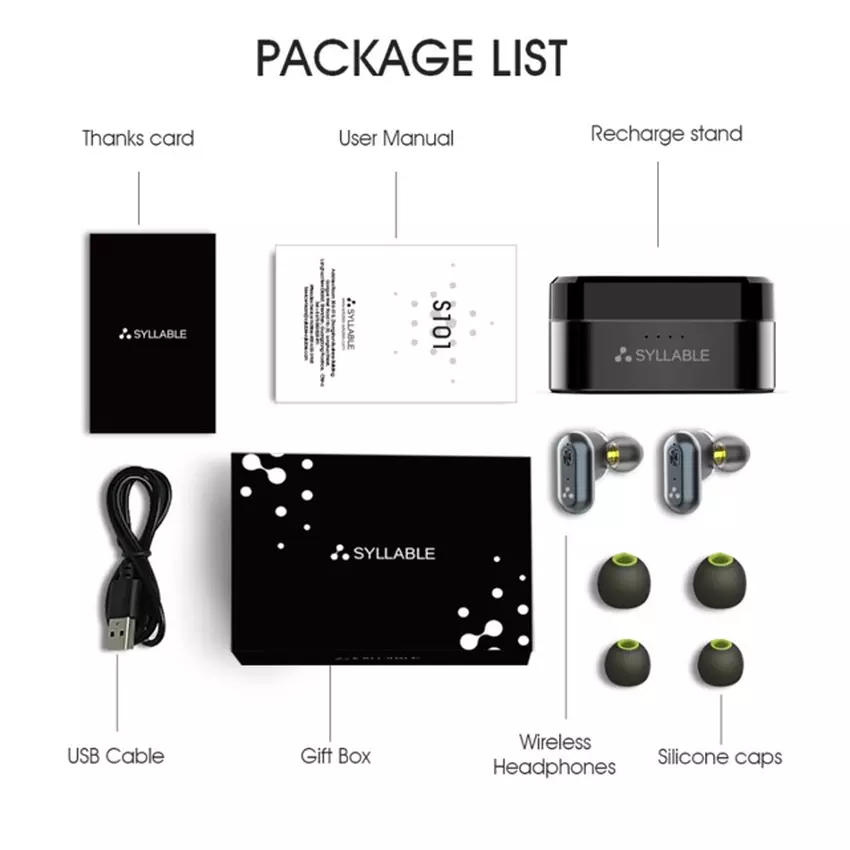 Ten model ma atrakcyjny wygląd, ochronę przed zachlapaniem IPX6 i 4 mikrofony. Ponadto Syllable S101 może się pochwalić układem Qualcomm QCC3020, dwoma sterownikami i Bluetooth 5.0 o zasięgu do 10 metrów. Każde słuchawki mają baterię 50 mAh. W skrzynce ładującej pojemność baterii wynosi 500 mAh. Przy takiej objętości Syllable S101 wytrzyma do 10 godzin. Są one ładowane przez port microUSB.