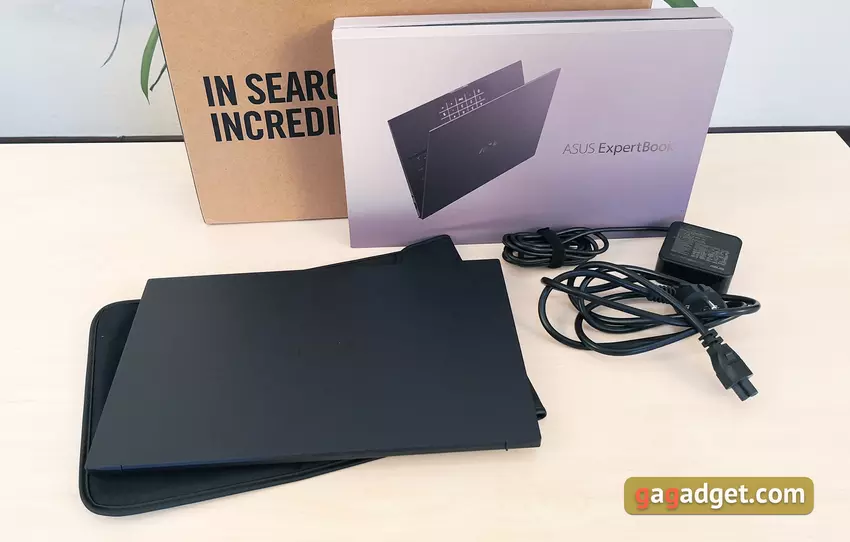 ASUS ExpertBook B9450FA jest pakowany w stosunkowo małe pudełko z tektury musztardowej z niewielką ilością nadruku. Tylko nazwa i najważniejsze informacje. Wewnątrz - mniejsze pudełko z samym laptopem, zasilacz 65 W, kabel zasilający, adapter Micro HDMI na LAN (nie było żadnego w naszej próbce testowej), pokrywa do transportu i dokumentacji.
