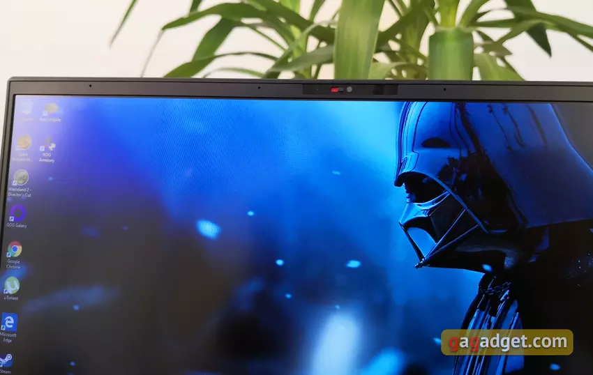 Laptop ma tak zwany wyświetlacz NanoEdge z cienkimi ramkami na całym obwodzie. Po bokach odstęp wynosi tylko 4 mm, górny jest nieco większy. Mieści kamerę internetową z fizyczną migawką, kamerę na podczerwień do określania twarzy właściciela i mikrofony. Jest ich 4, dla lepszej interakcji z asystentami głosowymi na odległość.