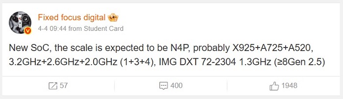 Z danych Fixed Focus Digital wynika, że chip będzie produkowany w technologii 4-nm TSMC N4P. Zgodnie z przeciekiem, chip otrzyma konfigurację rdzeni 1+3+4 z flagowym Cortex-X925 o taktowaniu 3.2 GHz, a także grafikę Imagination IMG DXT 72-2304 (1.3 GHz), która, według plotek, może przewyższyć Adreno 740 zintegrowane w Snapdragon 8 Gen 2.