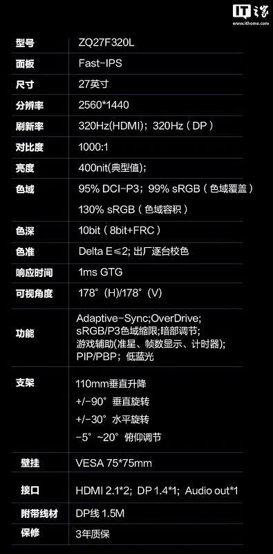 To 27″ monitor z matrycą Fast IPS i rozdzielczością 2K (2560×1440) przy częstotliwości odświeżania 320 Hz i czasie reakcji wynoszącym 1 ms (GtG).