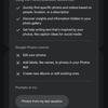 Drugi komponent umożliwia żądanie ważnych danych znalezionych na zdjęciach, takich jak tematy świąt, potrawy, numery dokumentów oraz kluczowe chwile podróży. Wyniki wyszukiwania są wyświetlane w aplikacji Google Zdjęcia, gdzie można zobaczyć dodatkowe dane.