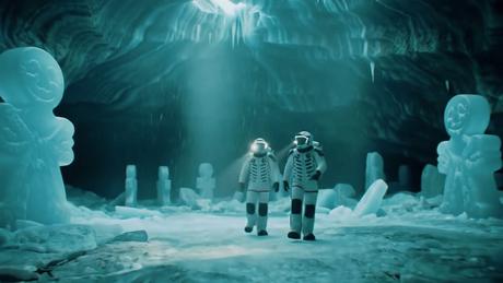 Szersza, powolna panorama ogromnej lodowej jaskini w zmierzchu. Z góry przebija się blade niebieskawe światło, które oświetla figury z lodu, zamarznięte w lodowych ścianach. Na środku idą dwie osoby w białych kostiumach kosmicznych, latarnie na ich hełmach świecą promieniami. Należy pokazać, jak duża i cicha jest jaskinia.