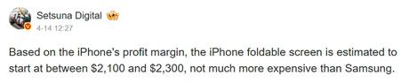 W serwisie społecznościowym Weibo informator stwierdził, że składny iPhone będzie kosztować klientów od $2100 do $2300, co uczyni go jednym z najdroższych przedstawicieli swojej klasy. Przypomnijmy, że Samsung Galaxy Fold 6 kosztuje $1900, Google Pixel 9 Pro Fold - $1800, a cena flagowego iPhone’a 16 Pro Max (który nie jest składany) rozpoczyna się od $1199.