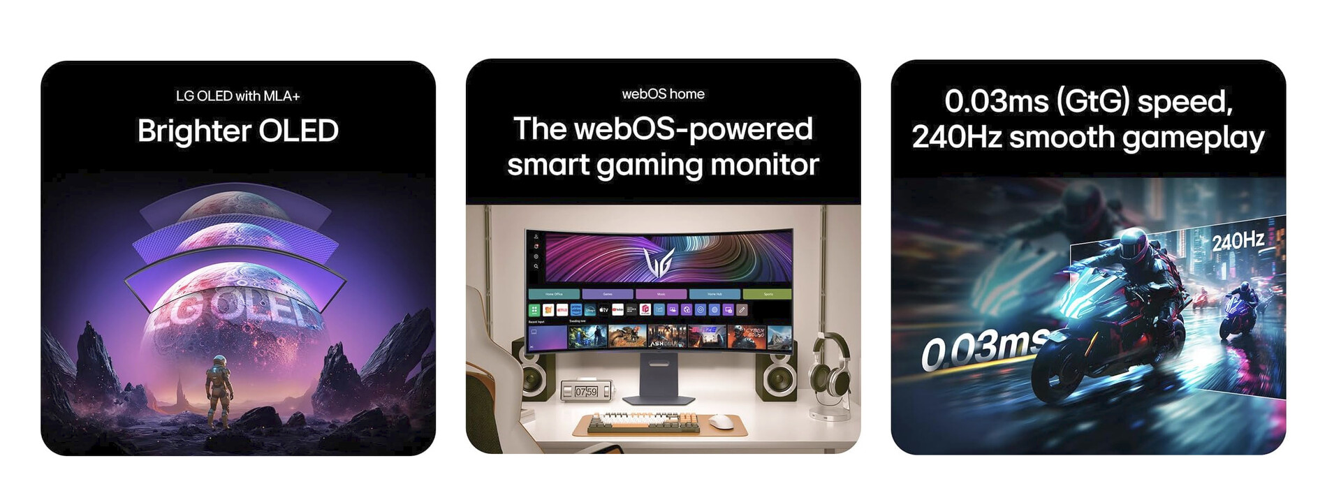 Monitor wyposażony jest w panel WOLED o rozdzielczości 3440 x 1440 pikseli, proporcjach 21:9 i czasie reakcji 0,03 ms, co pozwala osiągnąć dokładność i płynność w dynamicznych scenach. Pikowa jasność monitora wynosi 275 nitów, co zapewnia doskonałą widoczność nawet w jasnych pomieszczeniach.