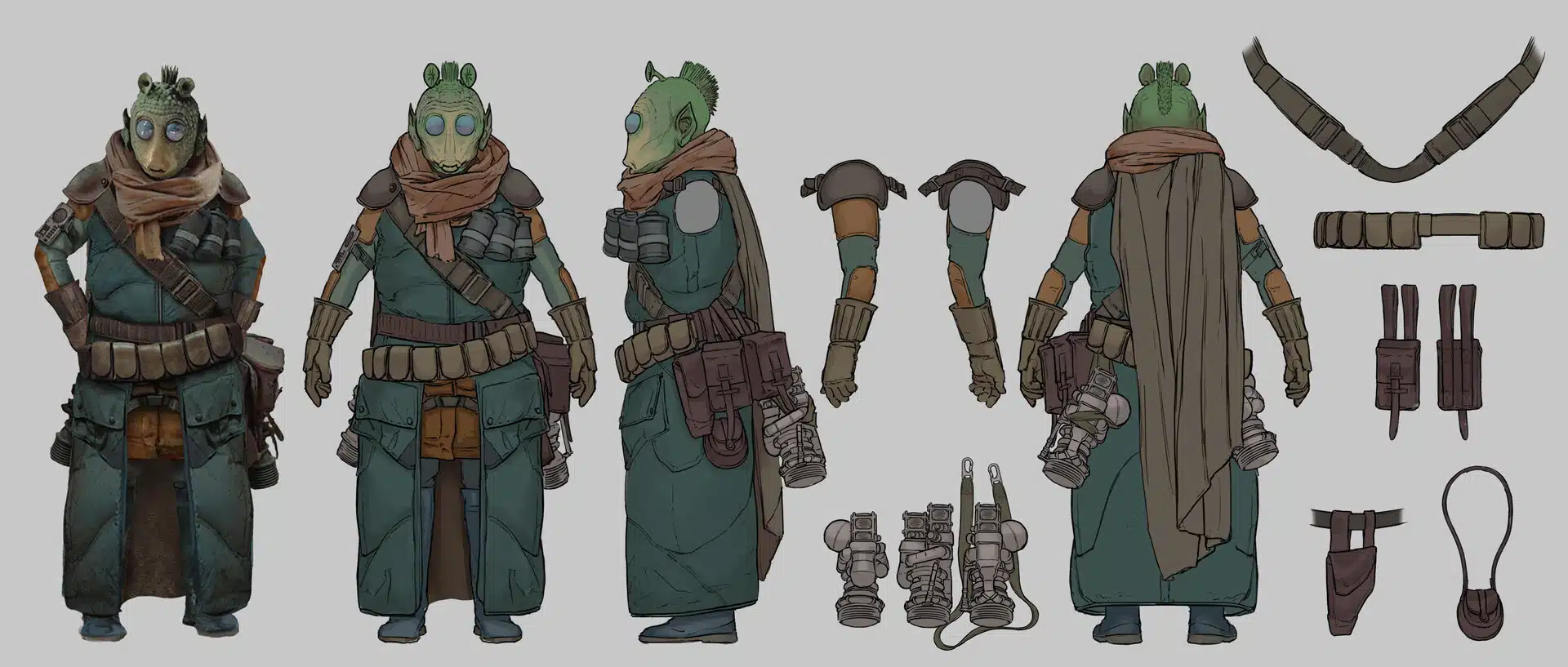 Ilustracje pochodzą z portfolio artysty, który niedługo pracował nad projektem. Trzynaście obrazów przedstawia różnych bohaterów w różnorodnych kostiumach i stylach wizualnych. Trzy z nich należą do gatunków, dobrze znanych fanom Gwiezdnych wojen, o czym świadczą nazwy plików: Zenesianin, Rodianin i Gungan – rasa nieszczęsnego Jar Jar Binka. Ponadto przedstawiono projekty handlarzy, z których każdy ma unikalne ubranie i ekwipunek.