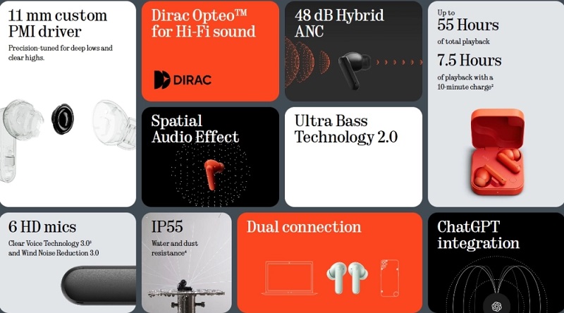 Słuchawki obsługują redukcję szumów do 42 dB oraz technologię Ultra Bass Technology 2.0, która poprawia jakość dźwięku. Słuchawki łączą się przez Bluetooth 5.4 i mają cztery mikrofony HD.