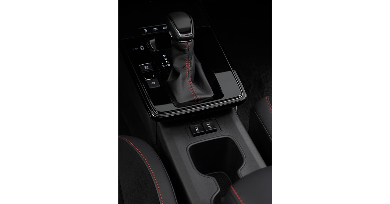 - Sportowe fotele z wykończeniem BRIN・NAUB (welur?+ ekoskóra), z czerwonymi przeszyciami i logo GR.